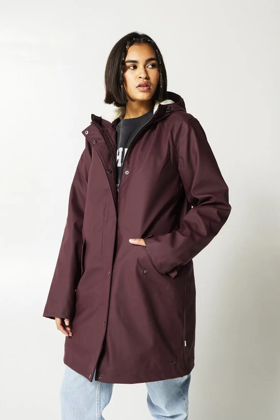 America Today dames regenjas. De Janice teddy is een lange regenjas met capuchon ideaal voor op de fiets. De capuchon kan doormiddel van een trekkoord aangetrokken worden voor extra bescherming. Daarnaast is de regenjas voorzien van een rits- en drukknoopsluiting en twee steekzakken met drukknoopsluiting. De teddy binnenstof houd je lekker warm tijdens de koude regen dagen.