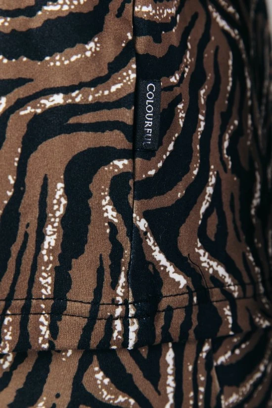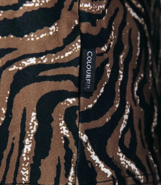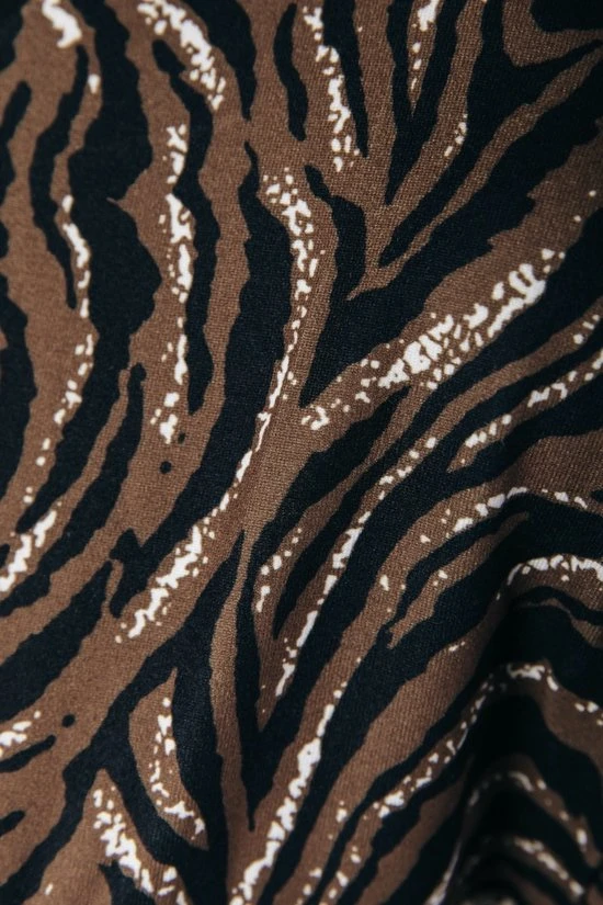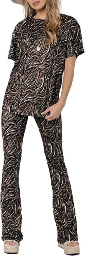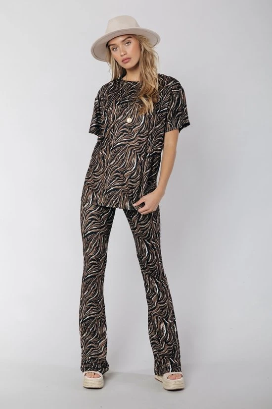 Loose fitRegular lengteKorte mouwCombineer met de matchende flare pants voor een complete lookTijger dessin87% polyester, 13% elastane, Peached jerseyStretch stofBinnenstebuiten machinewas 30°, niet in de droger, strijken of stomen op lichte temperatuur, niet bleken, wassen met gelijke kleurenModel is 1.70m en draagt S