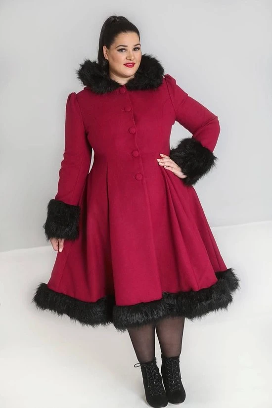 De elvira winterjas van hellbunny in burgundy- rood gevoerd. 5 met dezelfde stof beklede knopen. Naden over de buste die uitlopen in de taille om volume aan de zoom te creëren. Capuchon in dezelfde stof. Capuchon is afgezet met zwart nepbont. Zwarte rand van imitatiebont aan de manchetten. Zwarte rand van imitatiebont aan de zoom. Lijfje heeft naden aan de achterkant naar de taille. Open van taille tot zoom om volume te creëren. Lusje van dezelfde stof in de taille met 2 knopen van hetzelfde materiaal aan elk uiteinde. Jas is geheel gevoerd. Zakken in de naden opzij.Met de Elvira coat van Hellbunny uit Londen ben je klaar voor een winter in stijl. De elvira winterjas voor dames is gemaakt van 90% polyester,8% viscose,2% elastaan en de voering is 100% polyester.