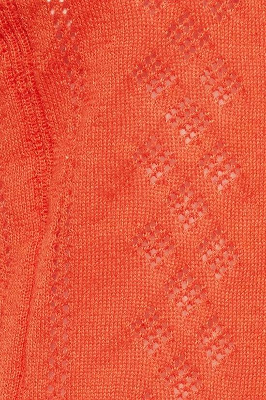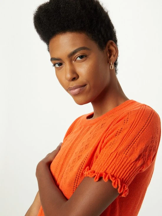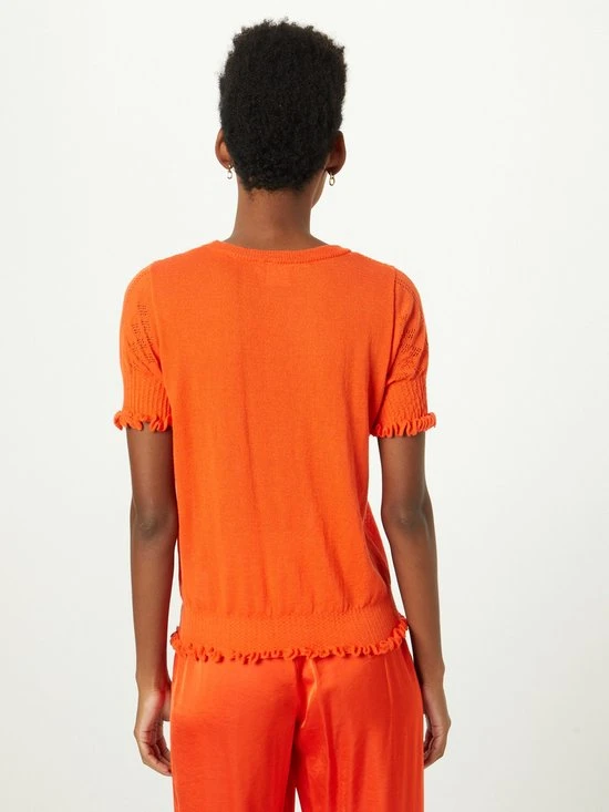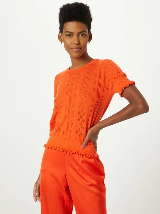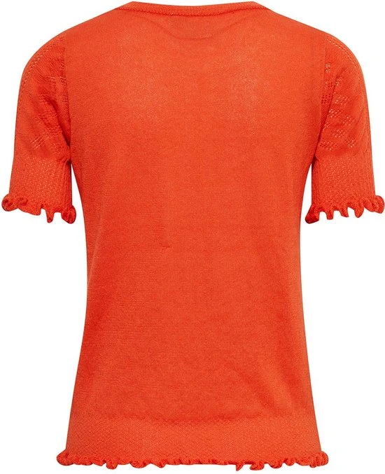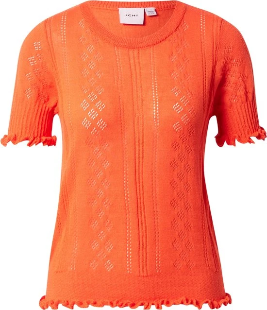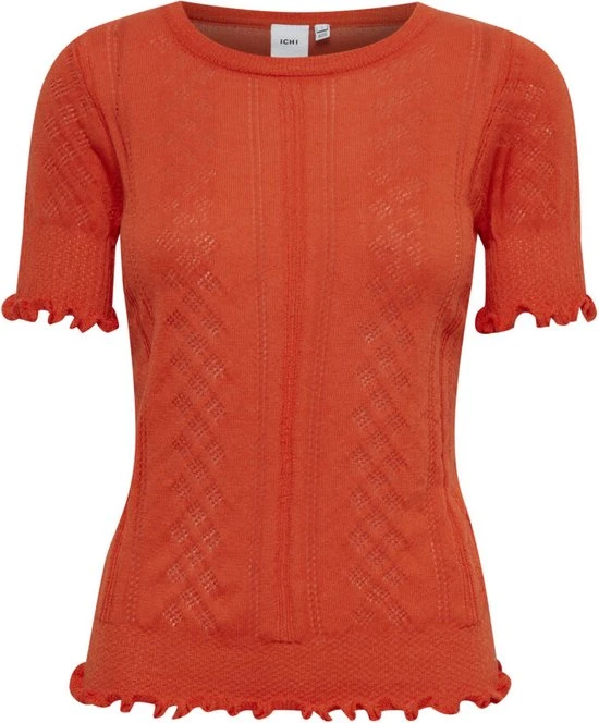 Fijngebreide trui van Ichi met ajour details. Dit model heeft korte mouwen en een ronde hals. De mouwen en onderkant zijn voorzien van ruches.
