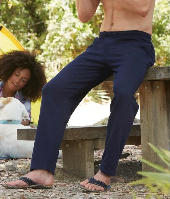 Donkerblauwe joggingbroek met open/rechte pijpen/straight leg. Unisex model klassieke joggingbroek met zeer comfortabele pasvorm. Materiaal: 80% katoen/20% polyester. Lengte binnen maat: S 79, M 80, L, 81, XL, 82 cm. Buiten maat: S 106, M 108, L 110, XL 112 cm. Sportbroek/trainingsbroek voor volwassenen.