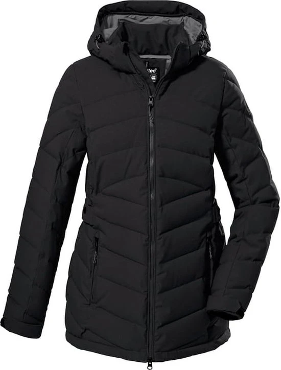 Mooie iets langere gewatteerde winter damesjas van Killtec. Model: 38641 / KOW 61. Kleur: zwart. Heerlijke jas winddicht, waterafstotend, ademend, afritsbare capuchon. Waterkollom 10.000. Gemaakt van 100% polyester