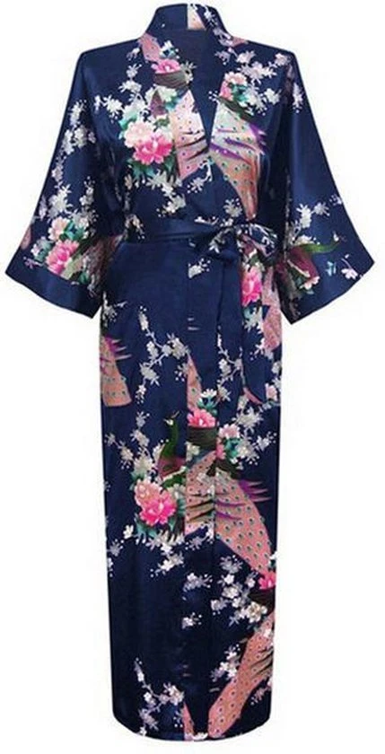 • Nachtblauwe geisha kimono met Japanse print met bloesem en pauwen,