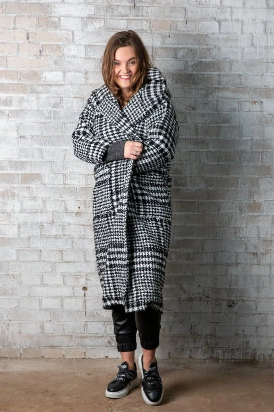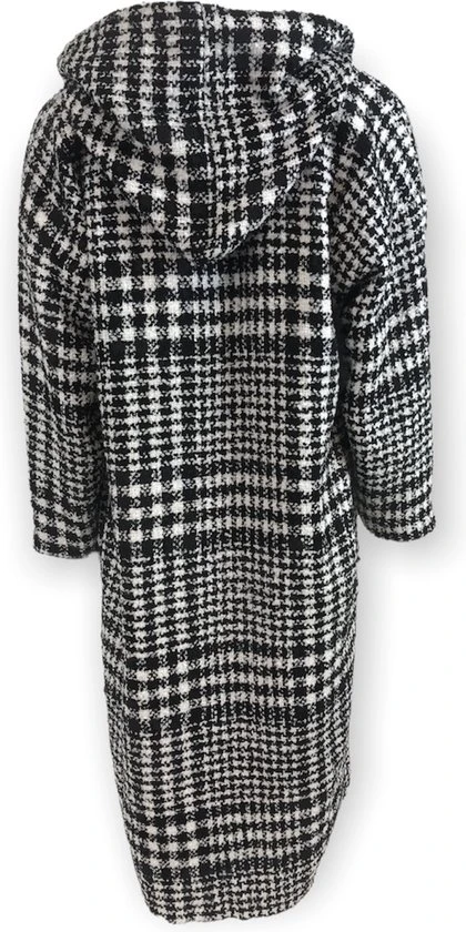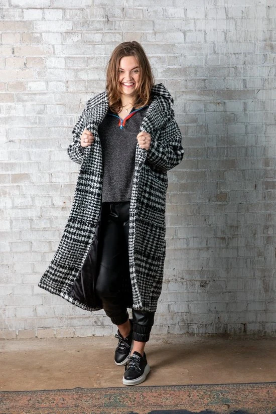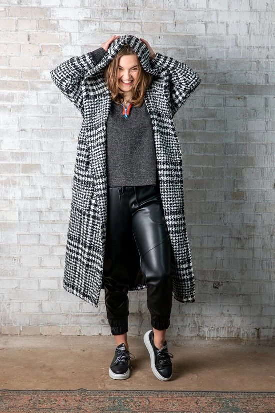 Geruite casual lange jas met knoopsluiting en 2 grote zakken aan de voorkant. Zwarte voering en capuchon. Draag de jas met een stijlvolle top of coltrui van La Pèra, broek en hoge hakken voor een elegante, zakelijke look of sportief met jeans en sneakers.