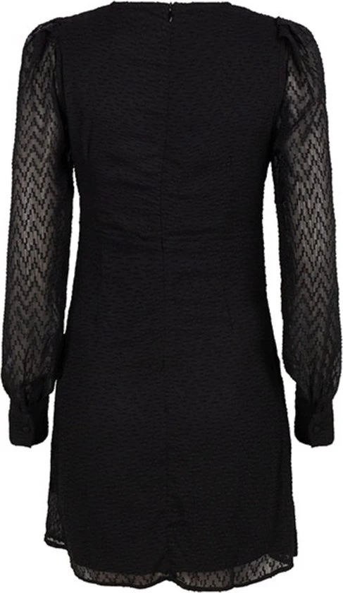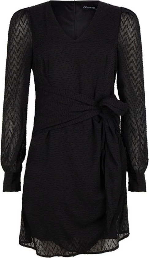Gestructureerde jurk van Lofty Manner met lange mouwen en een V-hals. De jurk sluit met een blinde ritssluiting in de nek en heeft een vast en breed strikkoord. De totale lengte is 90 cm bij maat S.