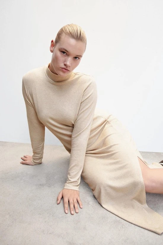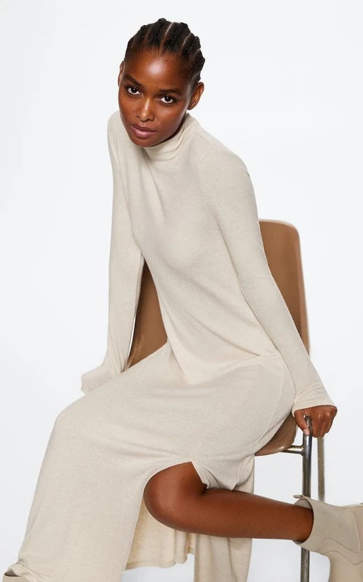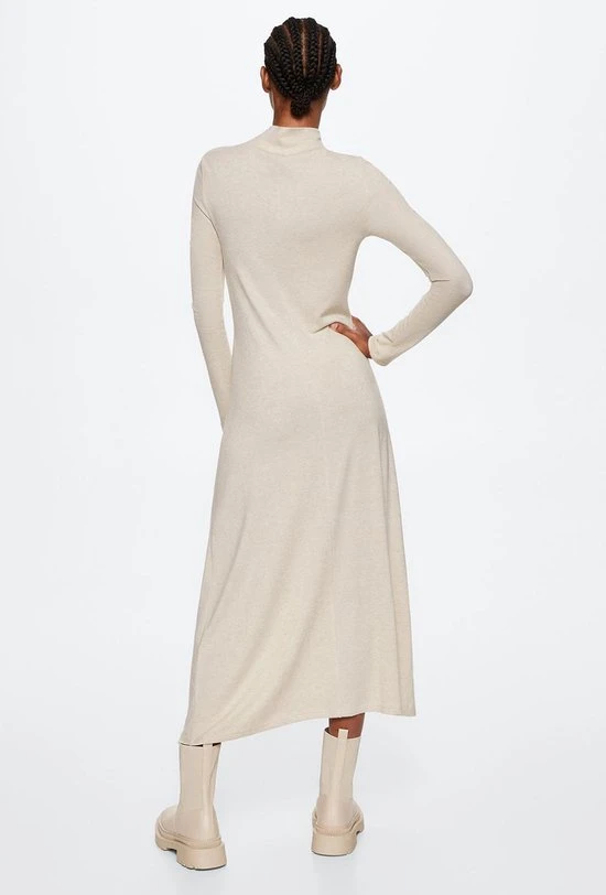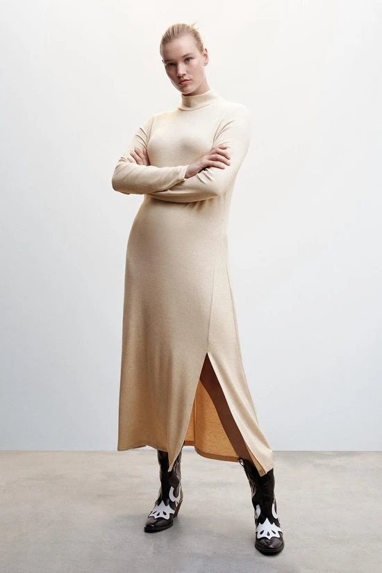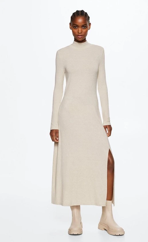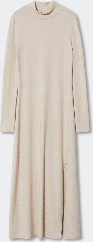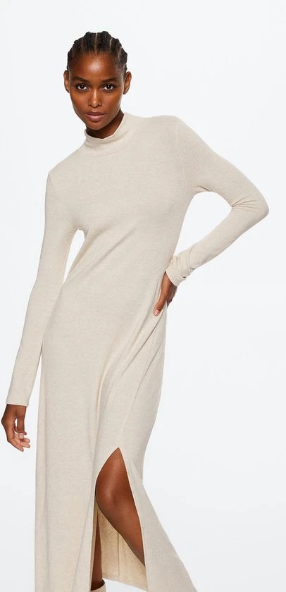 Fijngebreide jurk van Mango. Dit model heeft een highneckkraag en lange mouwen. De totale lengte is 122 cm bij maat S met een split van 45 cm aan de zijkant.