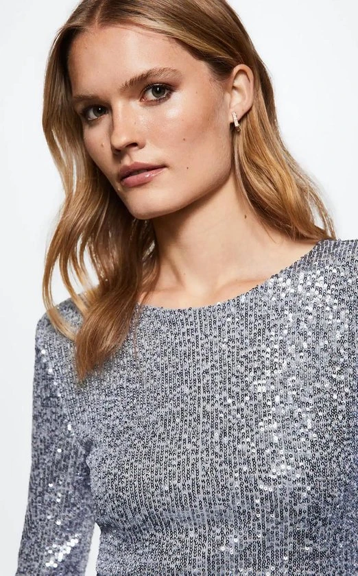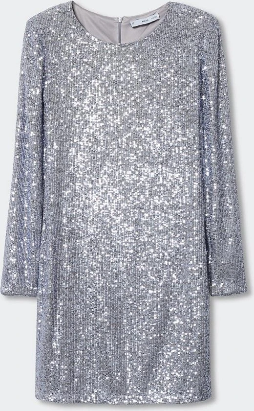 Feestelijke jurk van Mango met pailletten. Dit model heeft een ronde hals en lange mouwen. De jurk heeft een polyester voering en sluit met een blinde rits aan de achterkant. De totale lengte is 82 cm bij maat S.