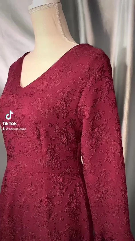 Bordeaux rood midi jurk met v hals en gebloemde details.