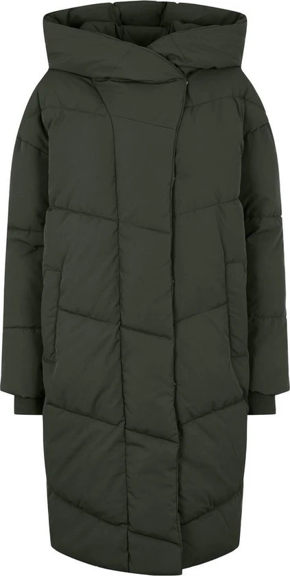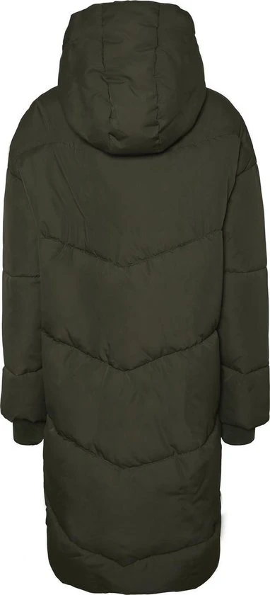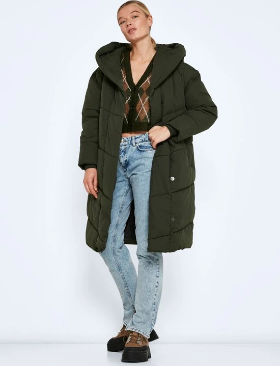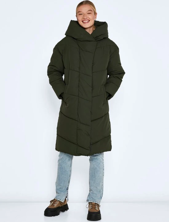 NOISY MAY donker groene gewatteerde jas. De lange puffer jacket heeft een capuchon met lekkere hoge kraag. De jas heeft een knoopsluiting, 2 zakken aan de zijkant en windstoppers bij de mouwen. Hij heeft een relaxed fitting.