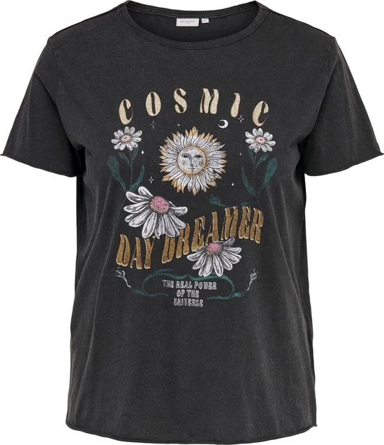 ONLY shirt CARMIKO opdruk, Maat M=46/48, met een advies prijs van: 21.99. Wat een super leuk shirt van ONLY Carmakoma model CARMIKO. Hij heeft op de voorkant een grote print met daarin in een