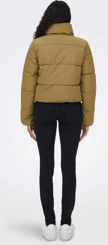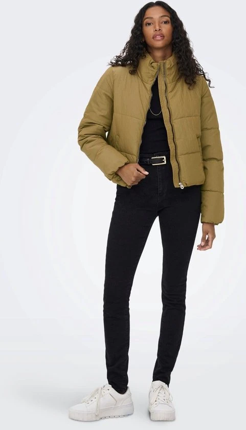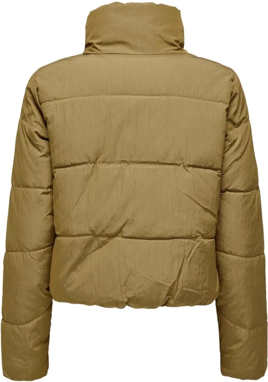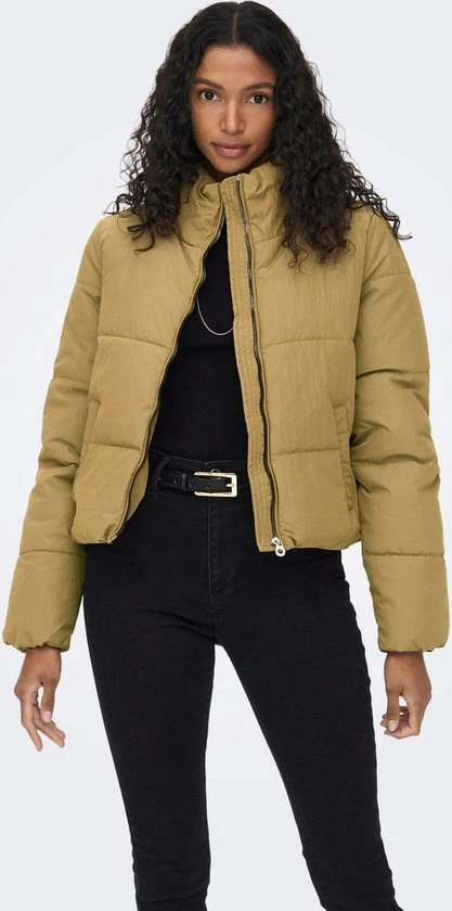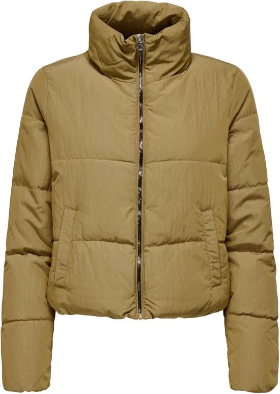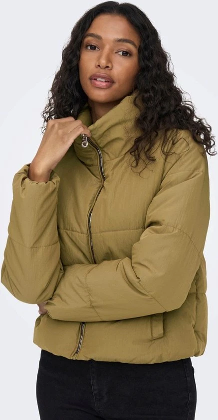 Gewatteerde tussenjas van Only. De lange mouwen hebben een elastische zoom. Dit model heeft een opstaande kraag en sluit met een rits. De jas heeft twee steekzakken aan de voorkant die sluiten met een drukknoop.