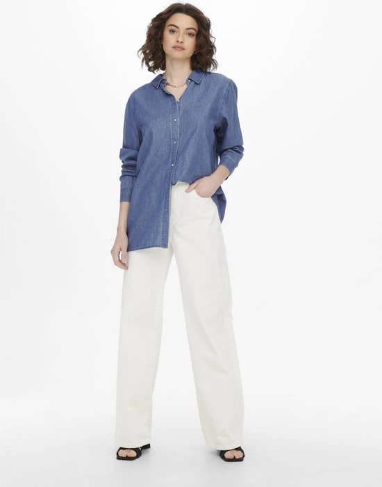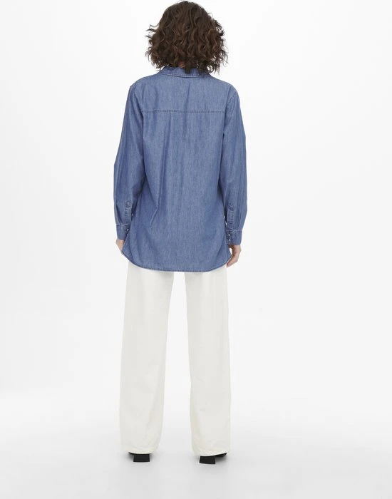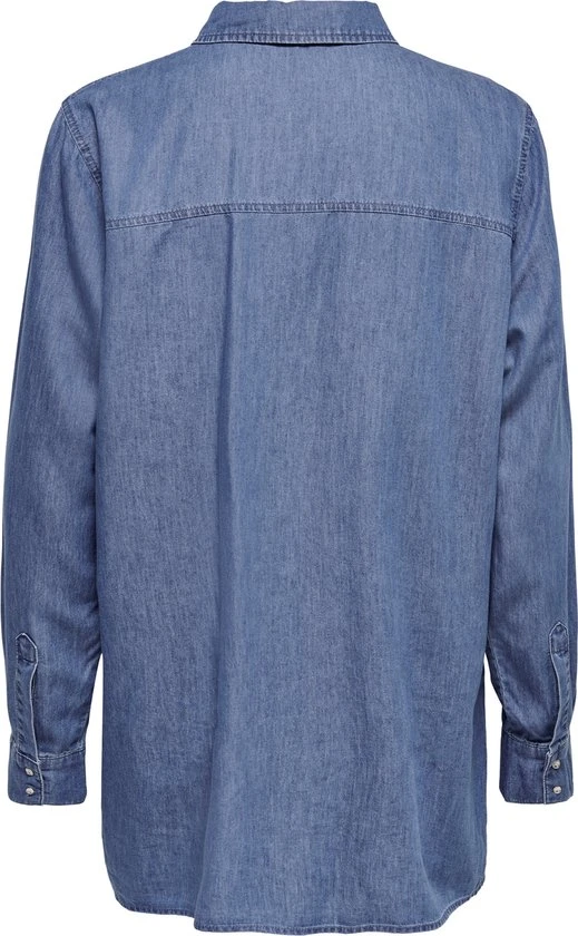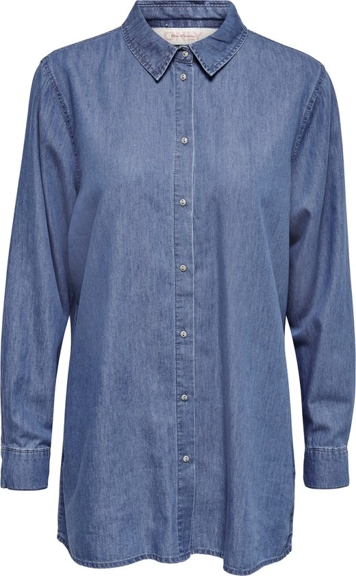 Lange denim blouse. Knoopsluiting aan de voorkant. Knopen aan de manchetten. Kraaghals
