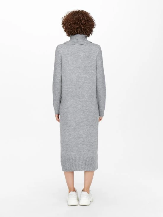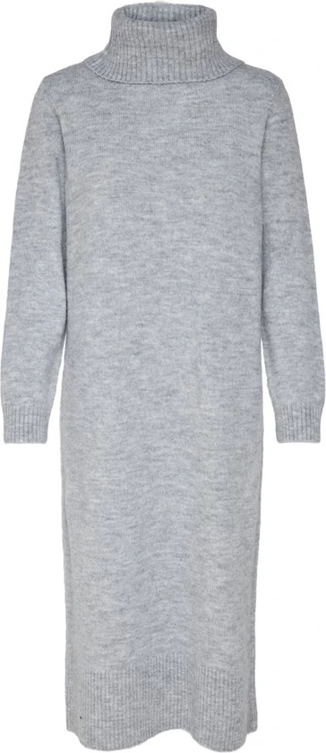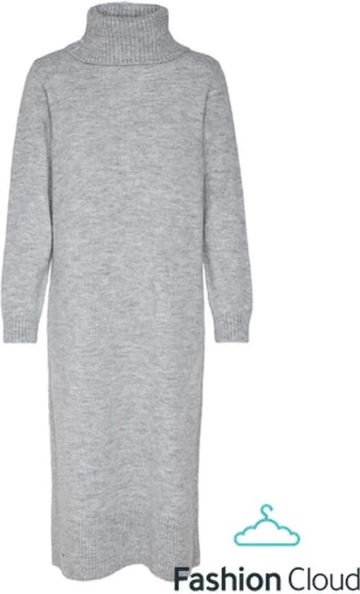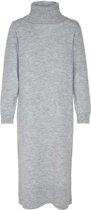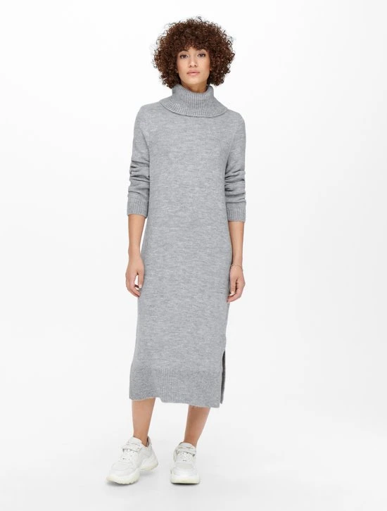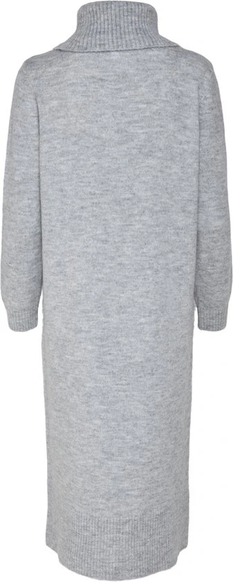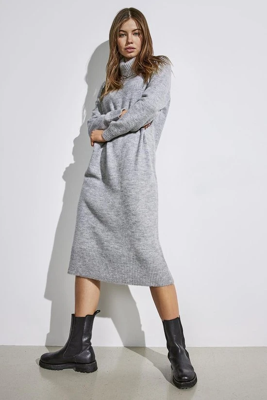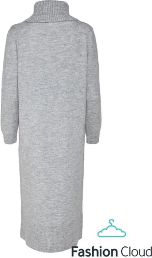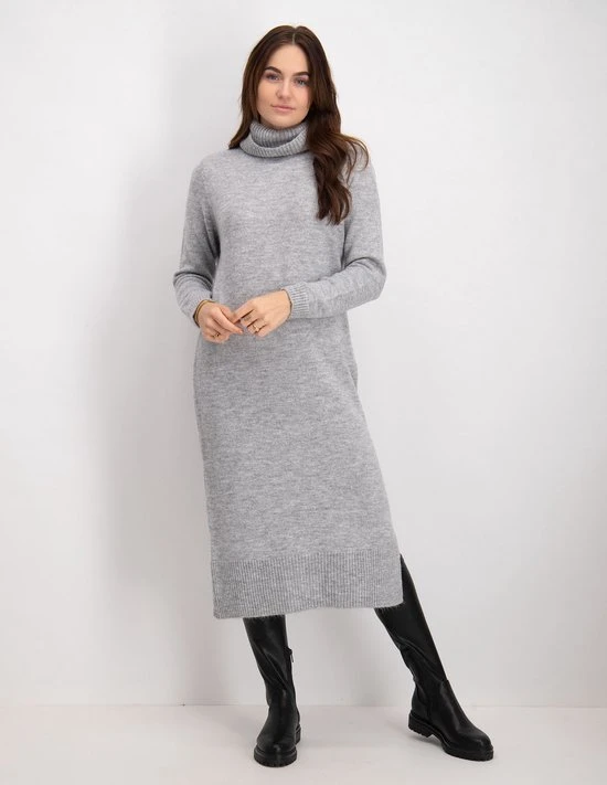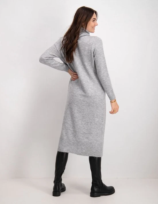 Lange gebreide jurk. Los getailleerd en een hoge hals. Lengte: 113 cm in maat S. Het model draagt maat S.