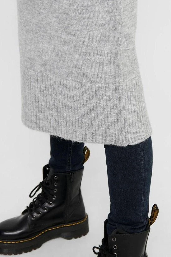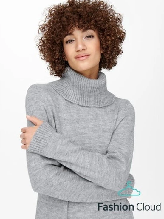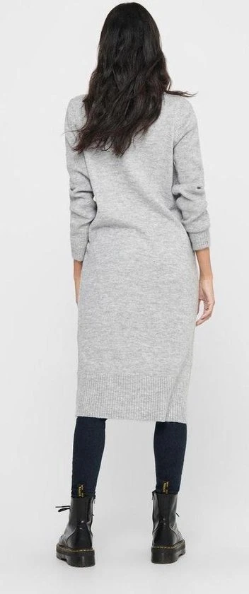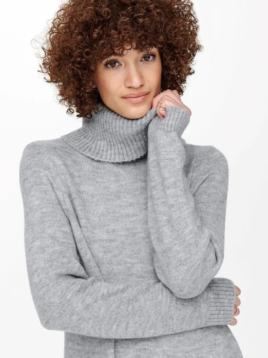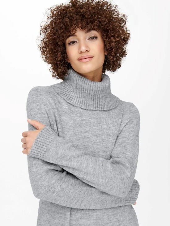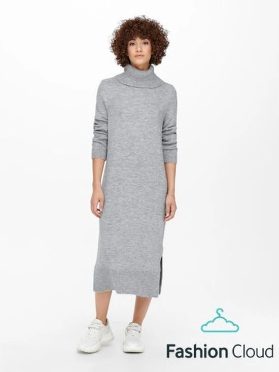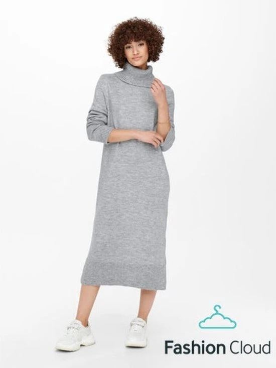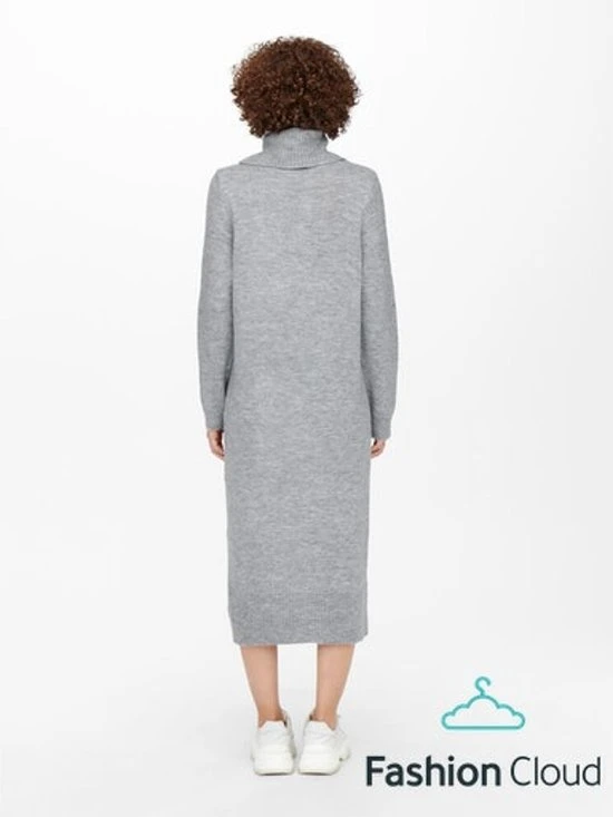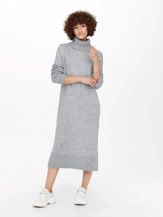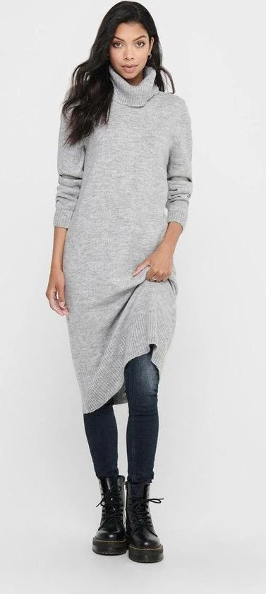 Lange gebreide jurk. Los getailleerd en een hoge hals. Lengte: 113 cm in maat S. Het model draagt maat S.