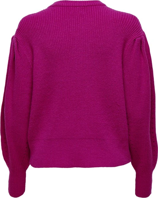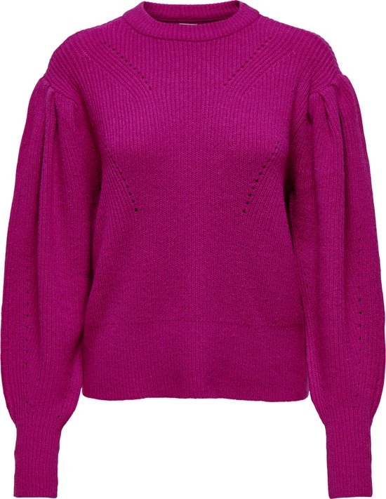 Gebreide trui met pofmouwen. Plooien bij de mouwinzet. Ronde hals