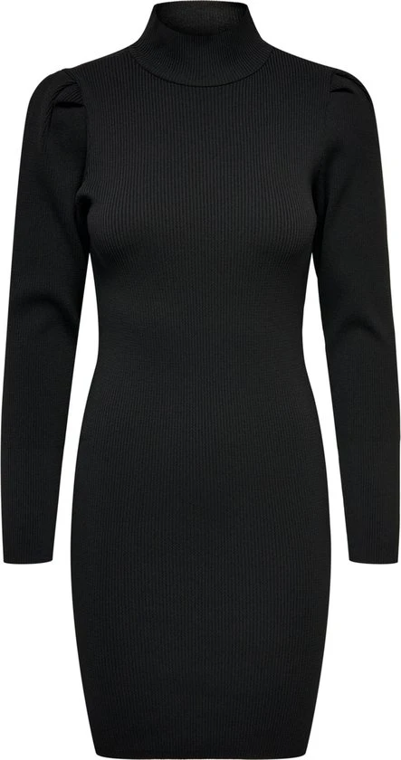 Rib jurk. Hoge hals en lange mouwen met pof detail op de schouder