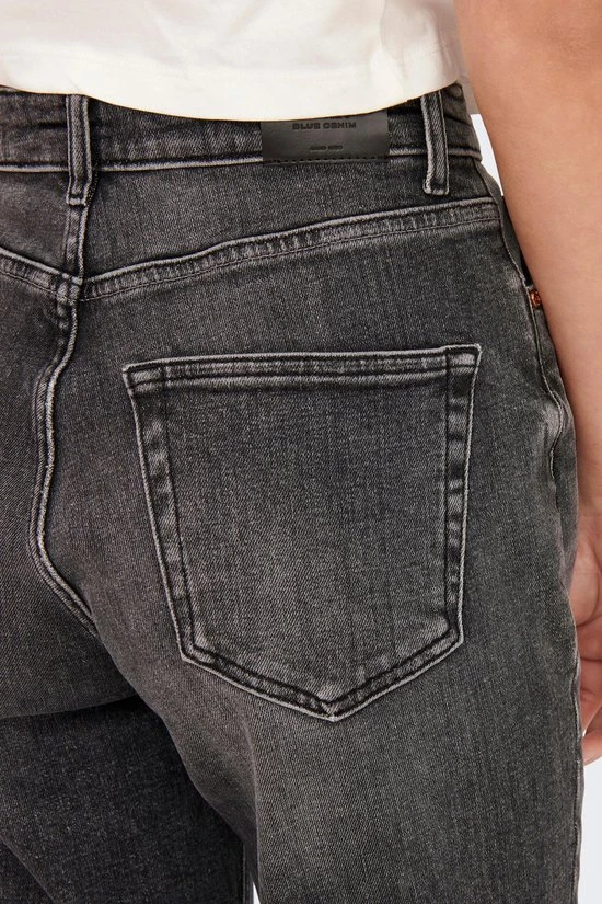 High-waist jeans tot op de enkel. 5-pocket model, 5 riemlussen en sluiting aan de voorkant