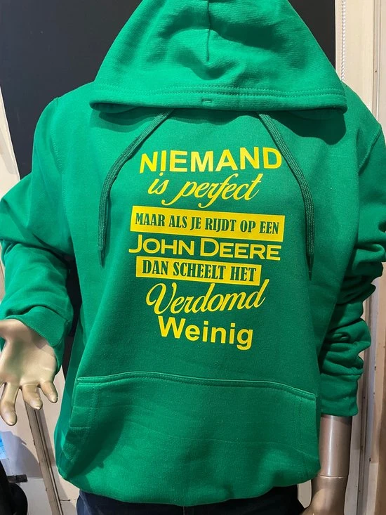 De hoodie is groen met gele letters. Echt John Deere.