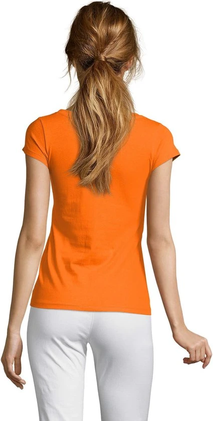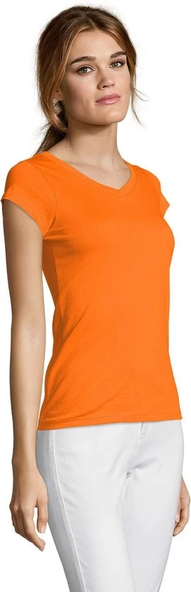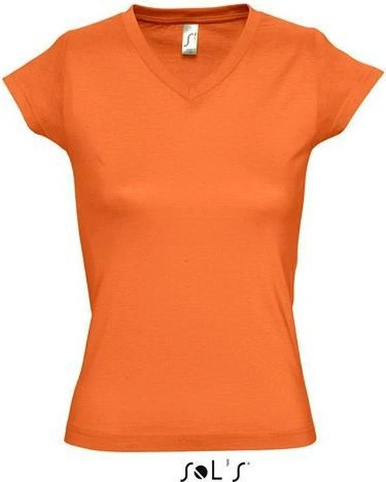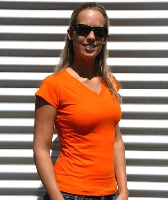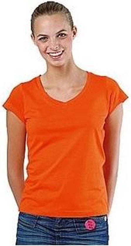 Dames t-shirt V-hals oranje. Basic dames t-shirt met korte mouw en V-hals verkrijgbaar in de kleur oranje. Deze dames shirts hebben een slimfit pasvorm. Materiaal: 100% katoen. Kwaliteit: 150 grams.