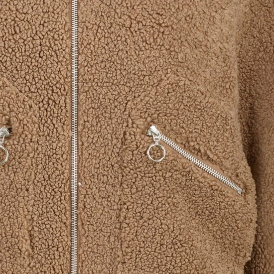 Bruine teddy jas voor dames. Voorzien van een ritssluiting, omgeslagen kraagje en elastische boorden. De korte teddy jas heeft twee zakken met ritsen en is gemaakt van 100% polyester.