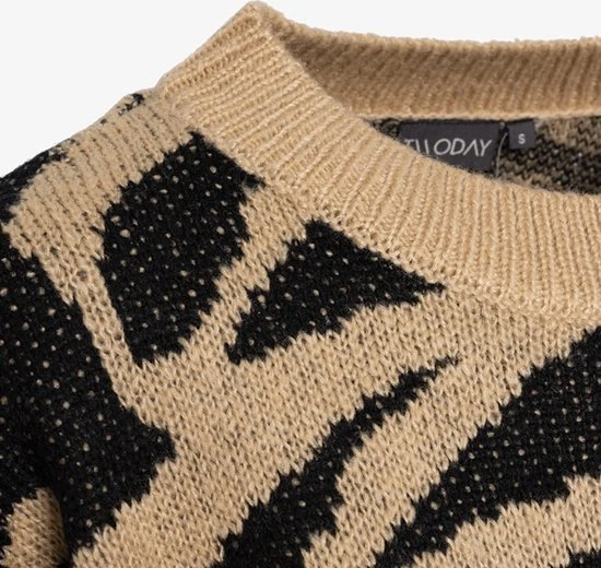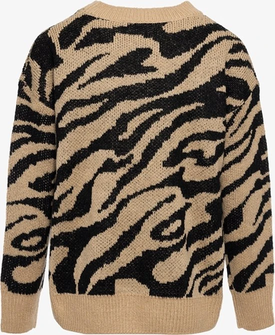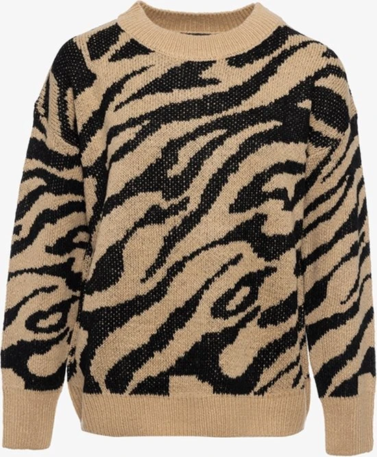 Beige dames trui met zebraprint uit de TwoDay collectie. Voorzien van een hoge, ronde hals en lange mouwen. De trui heeft een all over zebraprint. Gemaakt van 100% acryl.