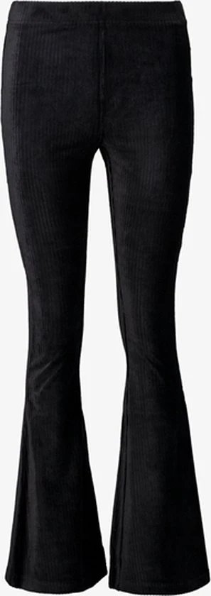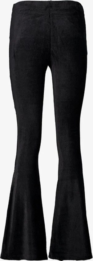 Zwarte, geribde broek voor dames. Voorzien van een elastische tailleband, aansluitende pasvorm en uitlopende broekspijpen. De flared broek is gemaakt van 95% polyester en 5% elastaan.