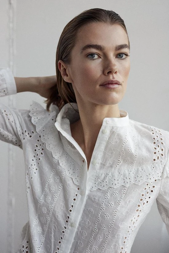 – Het model heeft een hoge hals, geborduurde stof (embroidery) en lange mouwen.