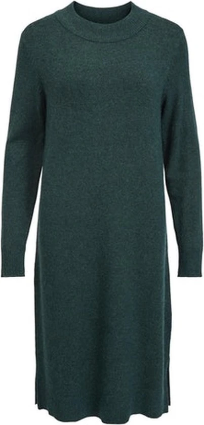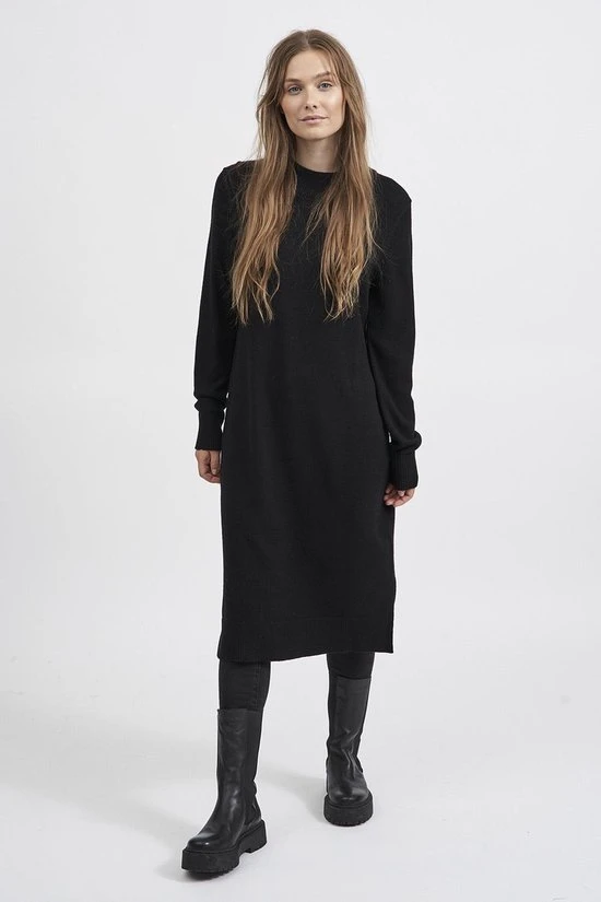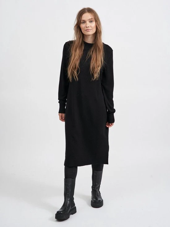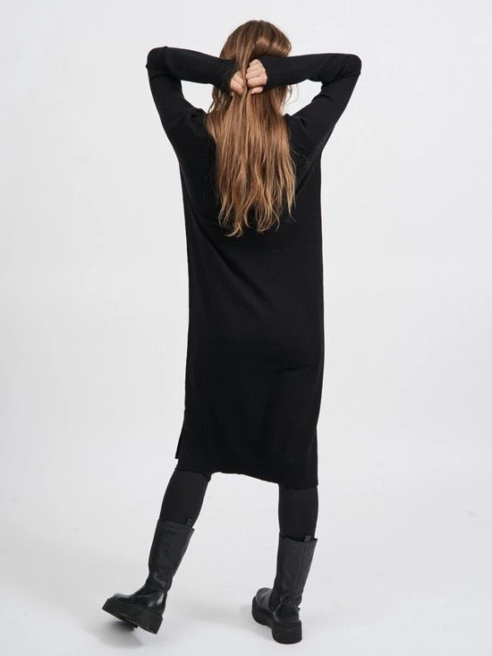 Viscose is een uitstekende optie als je op zoek bent naar een lichtgewicht stof die mooi drapeert en een glanzende afwerking heeft die zacht aanvoelt. – Type product : Gebreide jurk- Hals : Hoge hals- Mouw lengte : Lange mouwen- Mouwen : Normale mouwen- Manchetten : Geribde mouwuiteinden- Lengte : Zoom valt tot op gemiddelde hoogte, boven de knie.