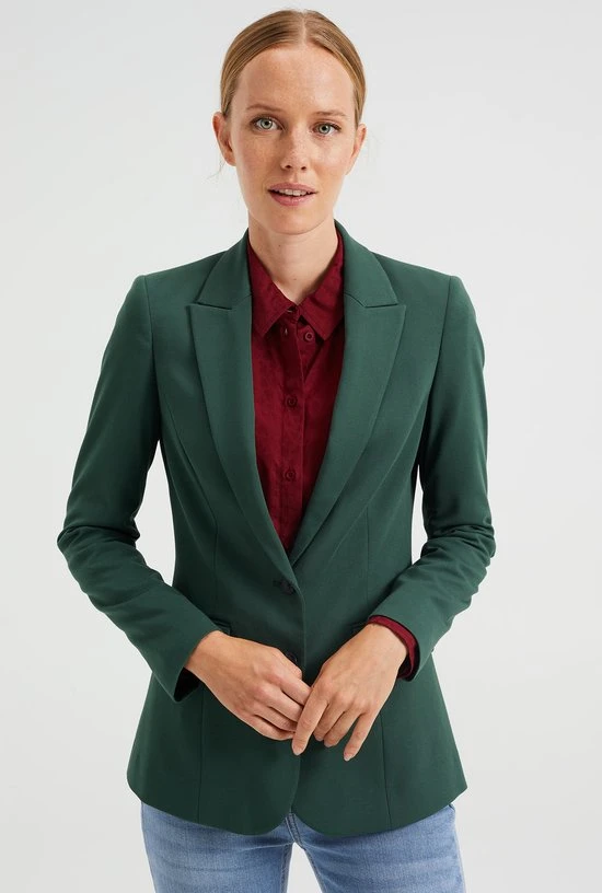 Een nauwsluitende blazer van een viscosemix met toegevoegde stretch. Het model heeft een knoopsluiting, twee klepzakken op het voorpand, een enkele split op het achterpand en lange mouwen. Gevoerd.