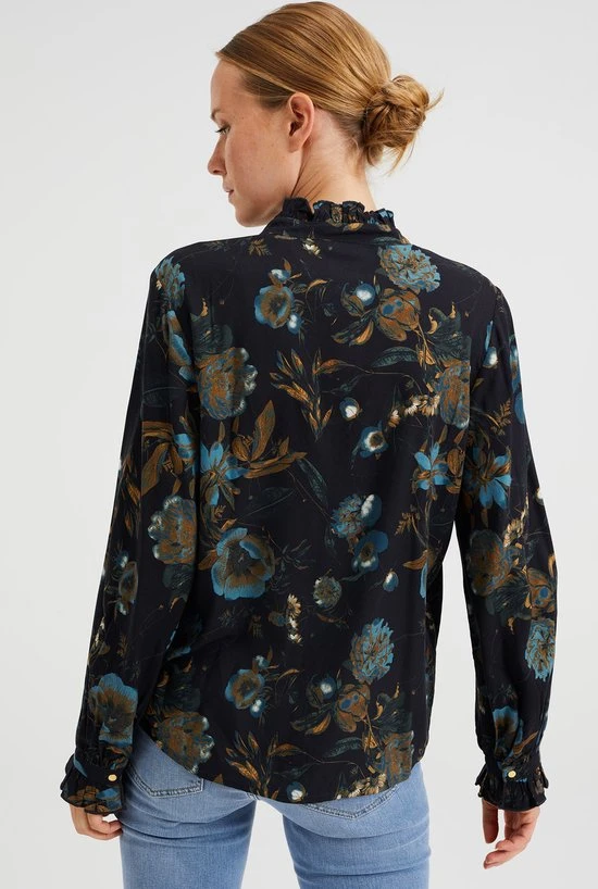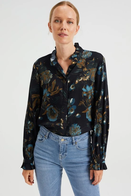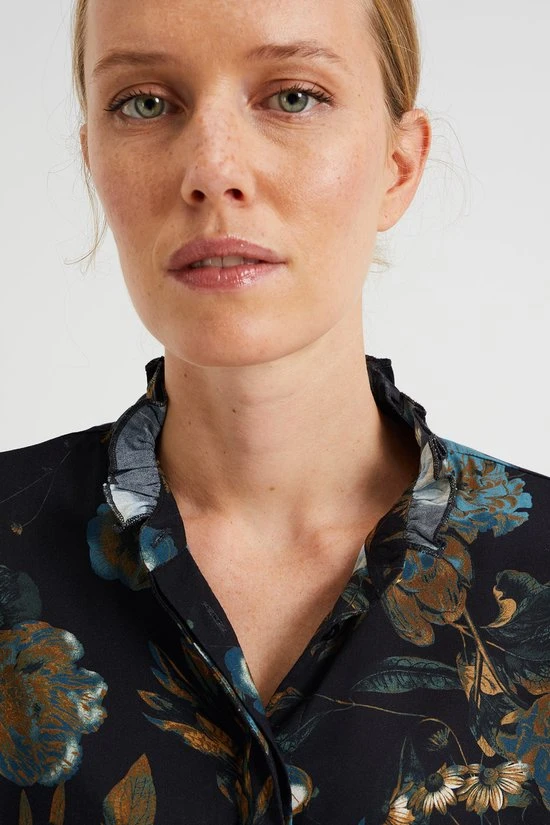 Een regular fit blouse van puur viscose met een dessin en details van ruches. Het model heeft een ronde hals, lange mouwen en een knoopsluiting