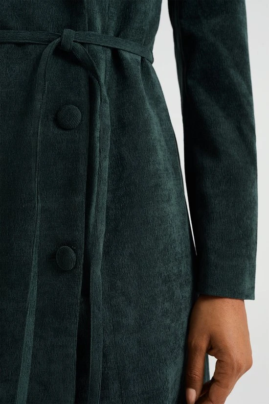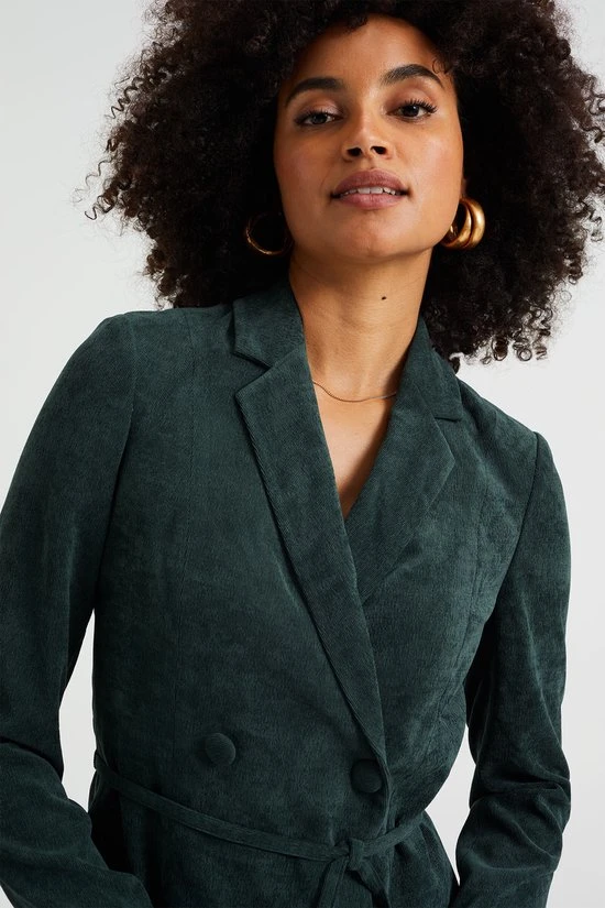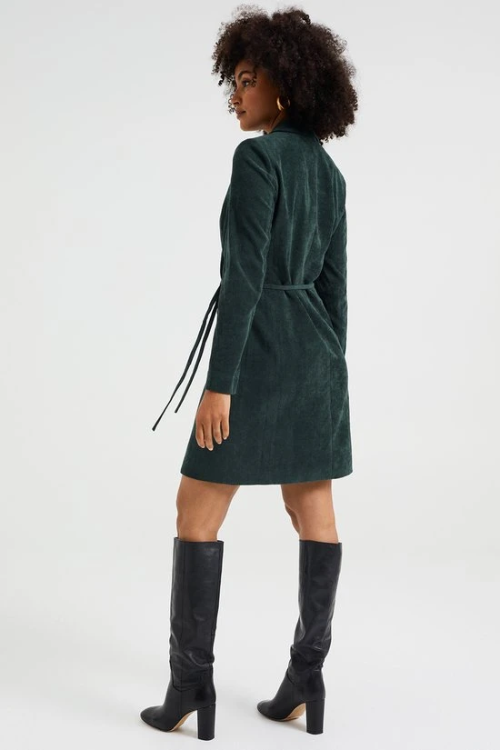 Een regular fit double-breasted blazerjurk van corduroy met toegevoegde stretch en een strikceintuur. Het korte model heeft een V-hals en lange mouwen. Gevoerd.