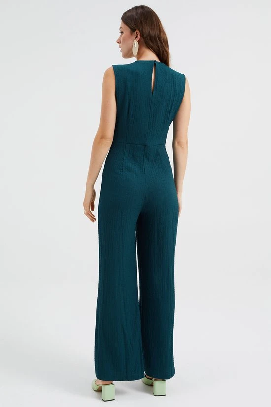 Een nauwsluitend jumpsuit van jersey met een structuur en een knoopdetail op het voorpand. Het mouwloze model heeft een V-hals, een knoopsluiting op het achterpand en lange rechte pijpen.
